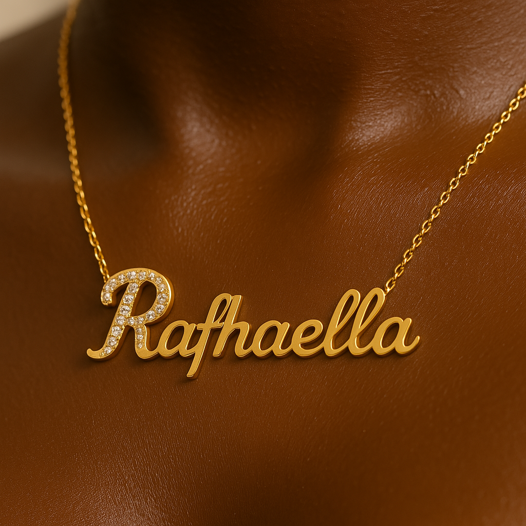 Deze gepersonaliseerde ketting in warm geelgoud werd speciaal ontworpen met de naam Rafhaella — met een initialenletter vol fonkelende diamanten als stralend begin
